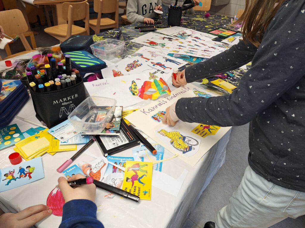 Die Klassen 3a und 3b hatten diese Woche die Möglichkeit, an einem Workshop zum Thema „Pänzrechte im Karneval“ des Vereins Zartbitter e.V. teilzunehmen. Drei Stunden lang konnten die Kinder zu diesem Thema Plakate malen und Masken oder Orden basteln. Dazu gab es die Gelegenheit, die Kinderrechte in Bewegung umzusetzen und zu singen. Zum Abschluss stellte jede Gruppe ihre Ergebnisse vor.