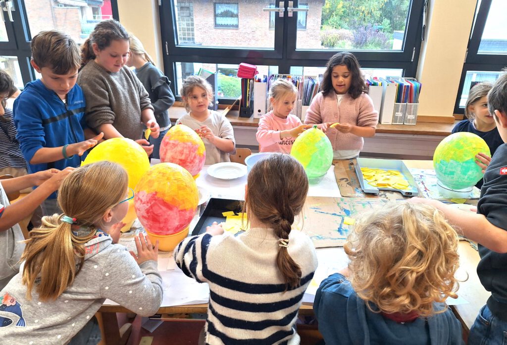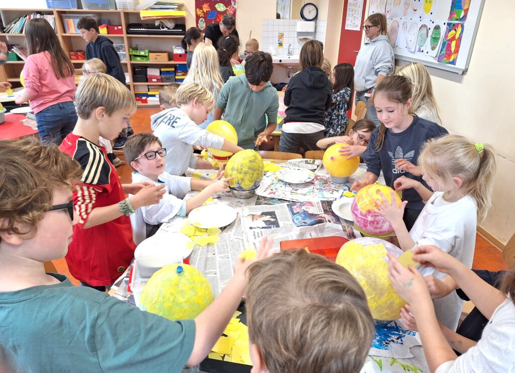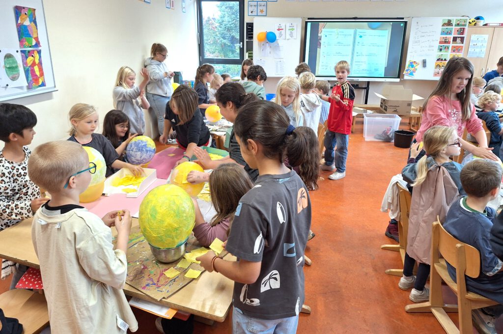 Oktober 2025 – Kurz vor den Herbstferien halfen die großen Paten aus der Igelklasse den kleinen Tigern beim Kleistern der Martinslaternen. Jetzt sind wir gespannt, wie die fertigen Laternen aussehen.
