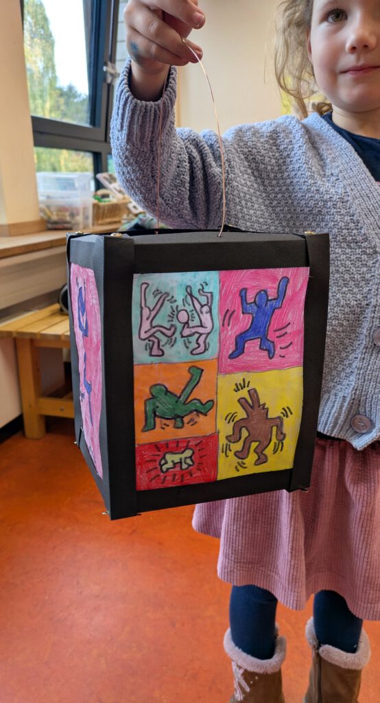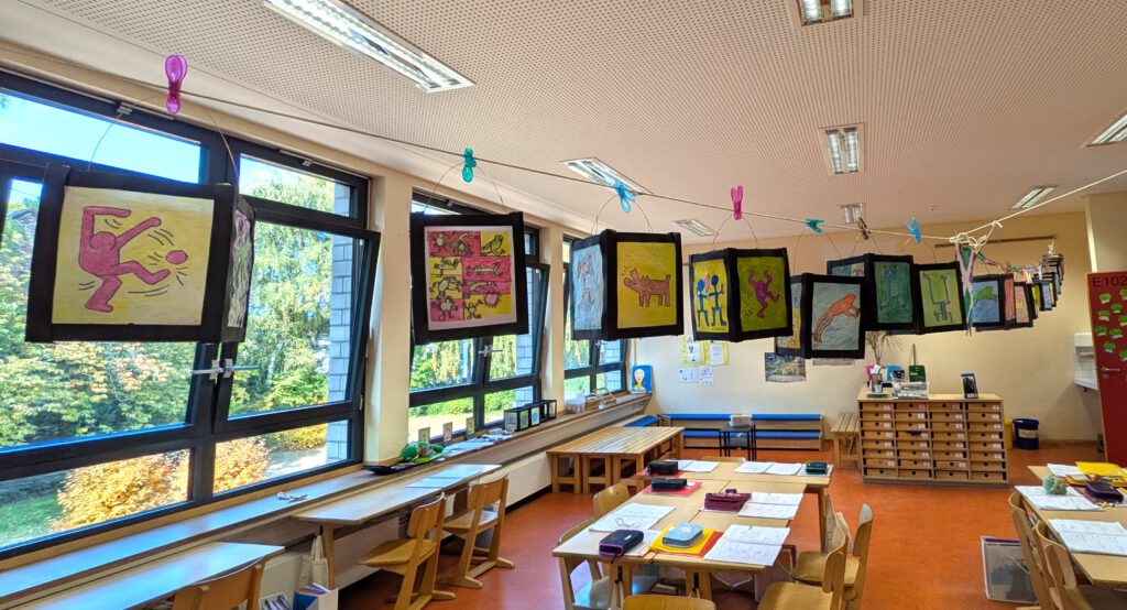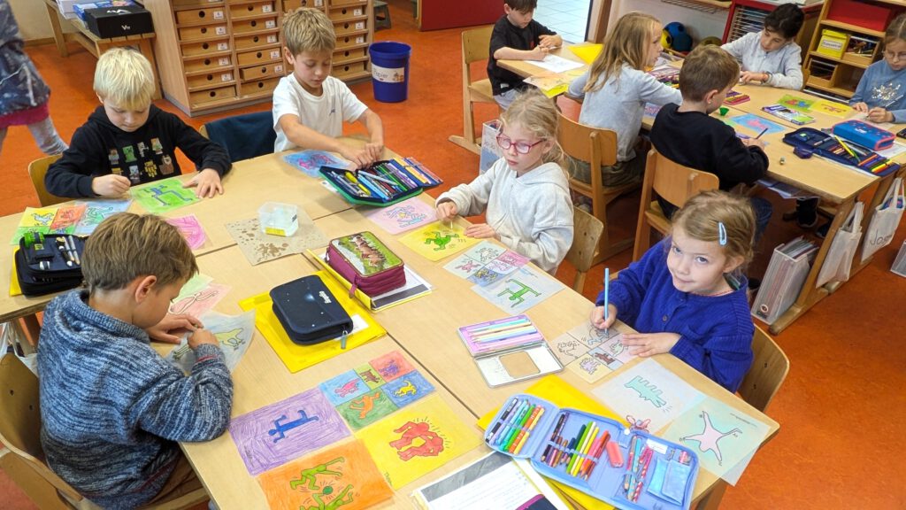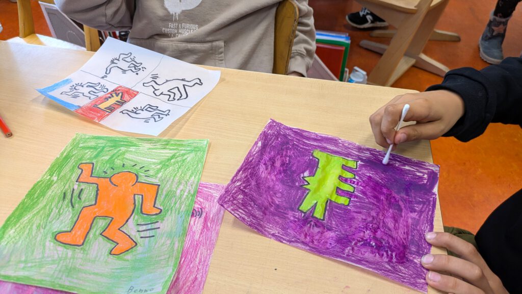 Oktober 2025 – Die Arbeit für die Laternen hat uns sehr viel Freude bereitet. Den Zeichenstil des Künstlers K. Haring haben wir uns genau angeschaut und sogar eigene Bilder in diesem Stil gezeichnet. Mit Wattestäbchen haben wir die Malstriche der Aquarellstifte verwischen können.