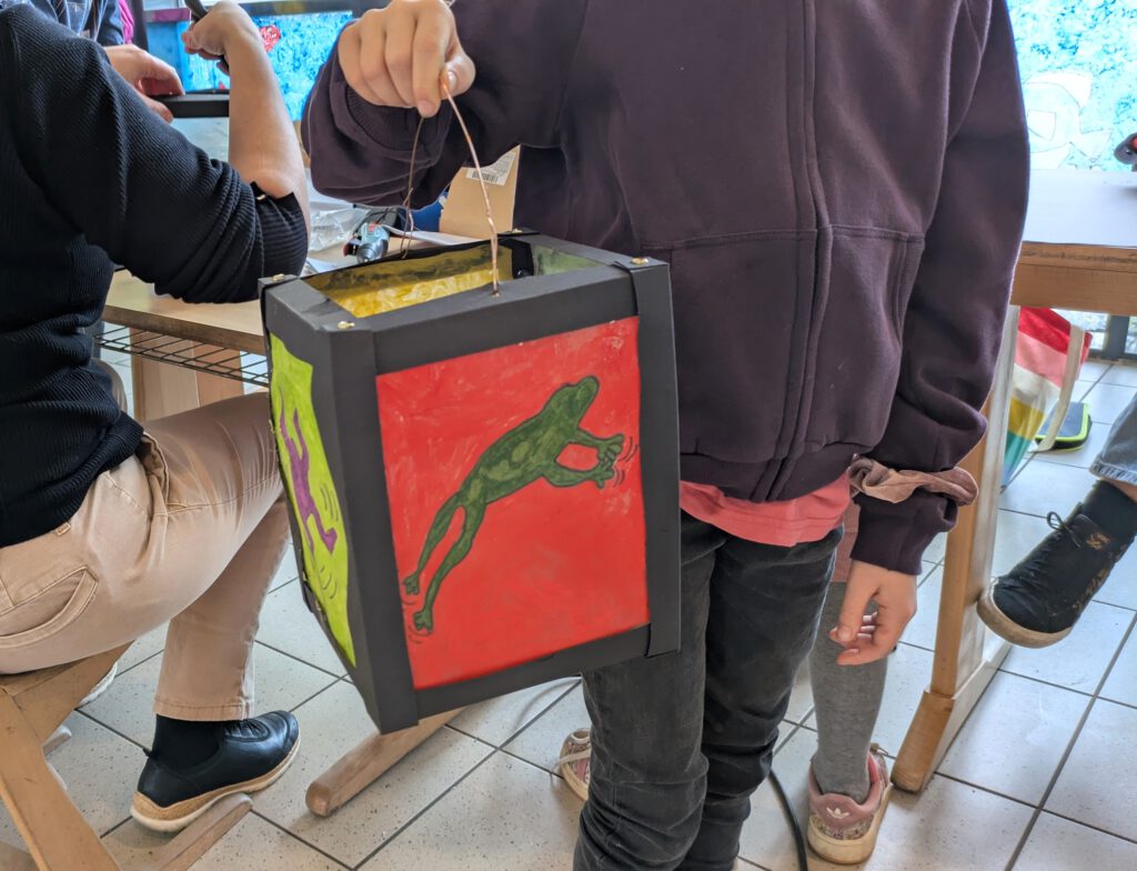 Oktober 2024 – Im ersten Schuljahr haben die Kinder eine zum Klassentier passende Laterne gebastelt. Die Paten haben uns sehr gut unterstützt und alle Laternen hängen schon im Klassenzimmer.