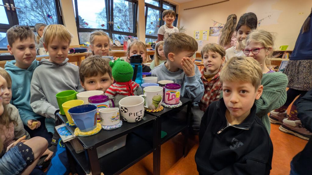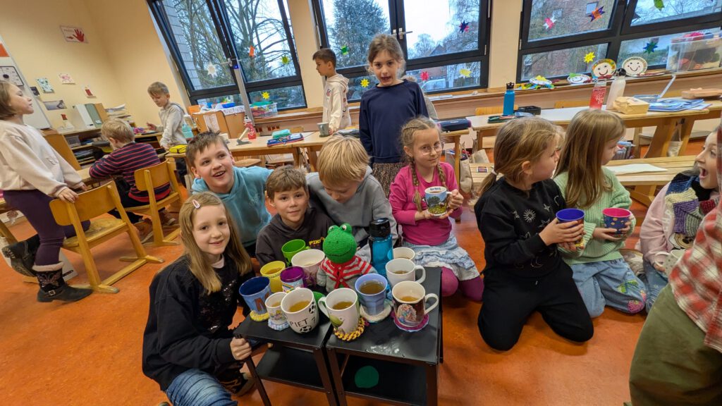 Februar 2026 – Die schönen Tassenuntersetzer kamen zur Feier des 1. Halbjahres zum Einsatz: Einen ganzen Schultag lang nur schöne Sachen machen: Tee trinken, Plätzchen essen, quatschen, und wieder eine Serie Checker Tobi schauen. Die Frösche sind zu Fans der Checker Tobi Sendungen geworden.