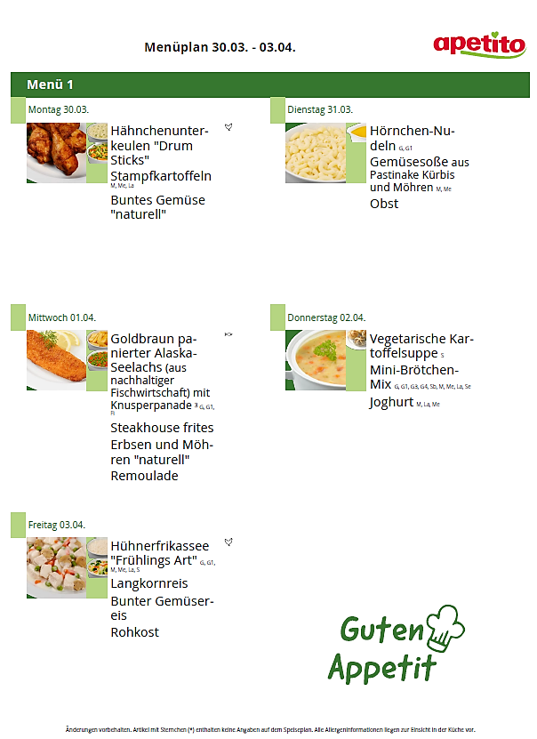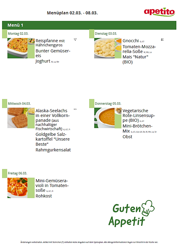 Das Mittagessen besteht aus einem Hauptgericht, welches teilweise mit Rohkost oder frischem Salat ergänzt wird und einem Nachtisch. Geliefert wird das Essen von Apetito. Dabei handelt es sich um Tiefkühlware, welche in der Küche nochmals in dafür vorgesehenen Behältern erwärmt wird. Apetito bietet zertifizierte Speisekomponenten, die durch die Deutsche Gesellschaft für Ernährung e. V. (DGE) mit dem Logo „DGE ZERT-KONFORM“ ausgezeichnet wurden, an. Getränke werden zum Essen und den ganzen Tag über bereitgestellt.