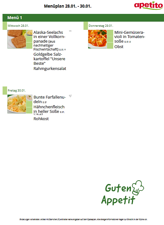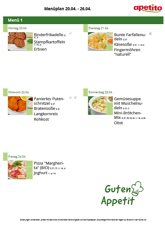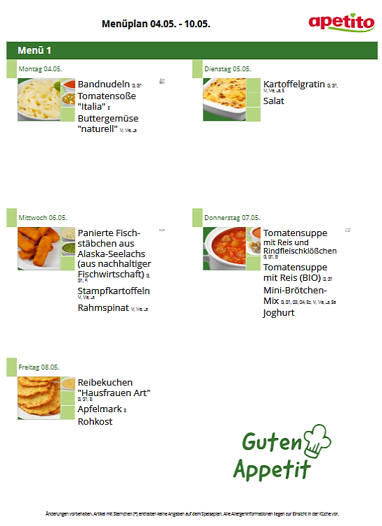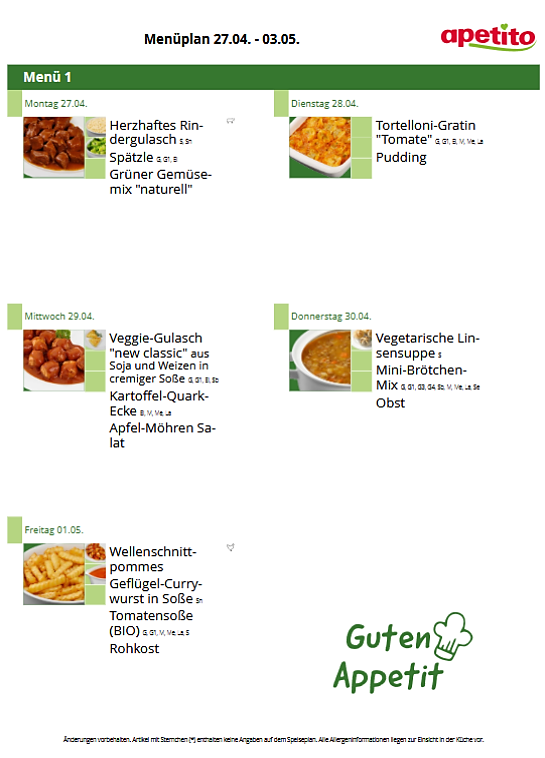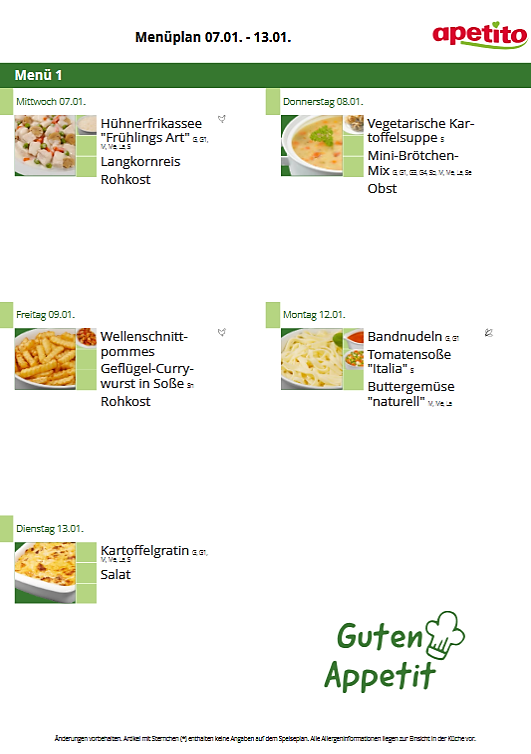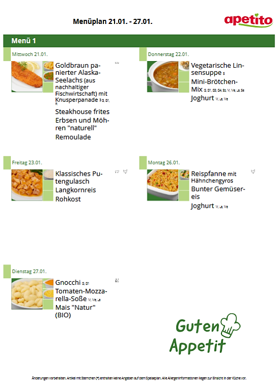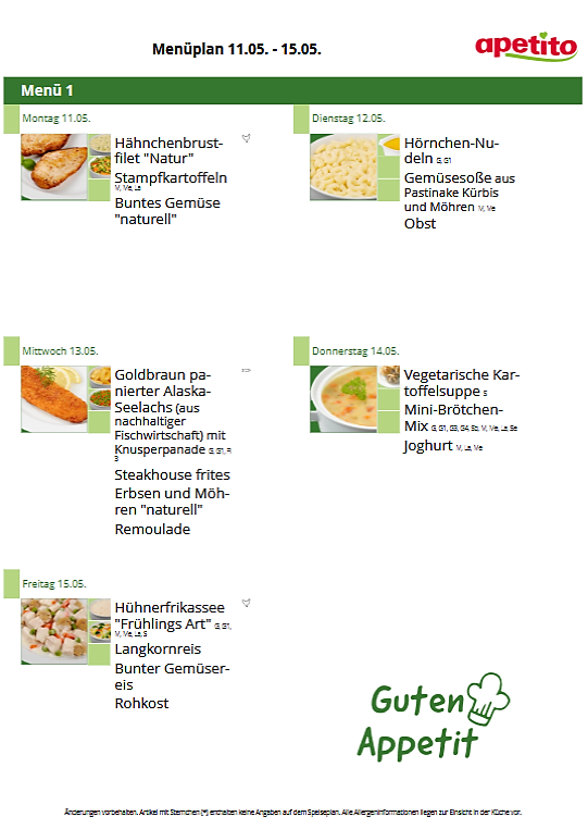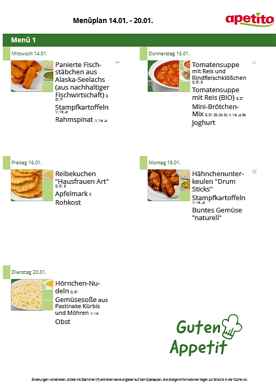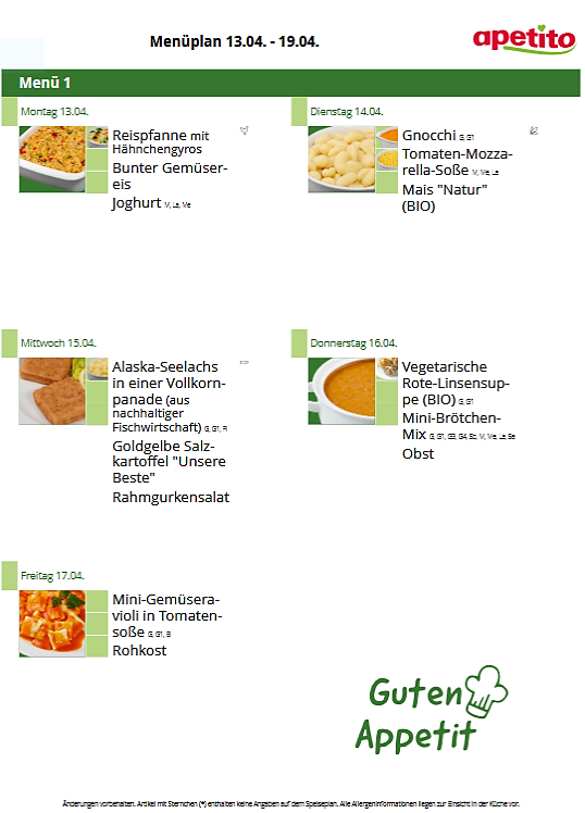Das Mittagessen besteht aus einem Hauptgericht, welches teilweise mit Rohkost oder frischem Salat ergänzt wird und einem Nachtisch. Geliefert wird das Essen von Apetito. Dabei handelt es sich um Tiefkühlware, welche in der Küche nochmals in dafür vorgesehenen Behältern erwärmt wird. Apetito bietet zertifizierte Speisekomponenten, die durch die Deutsche Gesellschaft für Ernährung e. V. (DGE) mit dem Logo „DGE ZERT-KONFORM“ ausgezeichnet wurden, an. Getränke werden zum Essen und den ganzen Tag über bereitgestellt.